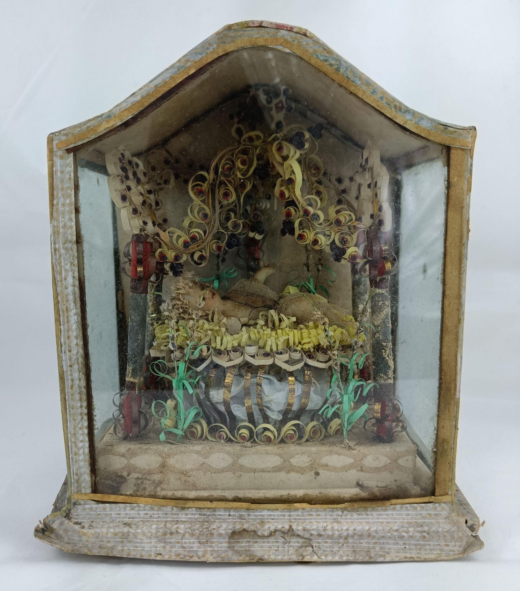 Es handelt sich um eine Klosterarbeit, gefertigt von Schwestern. Solche Objekte wurden in Frauenklöstern zur Weihnachtszeit häufig hergestellt.
